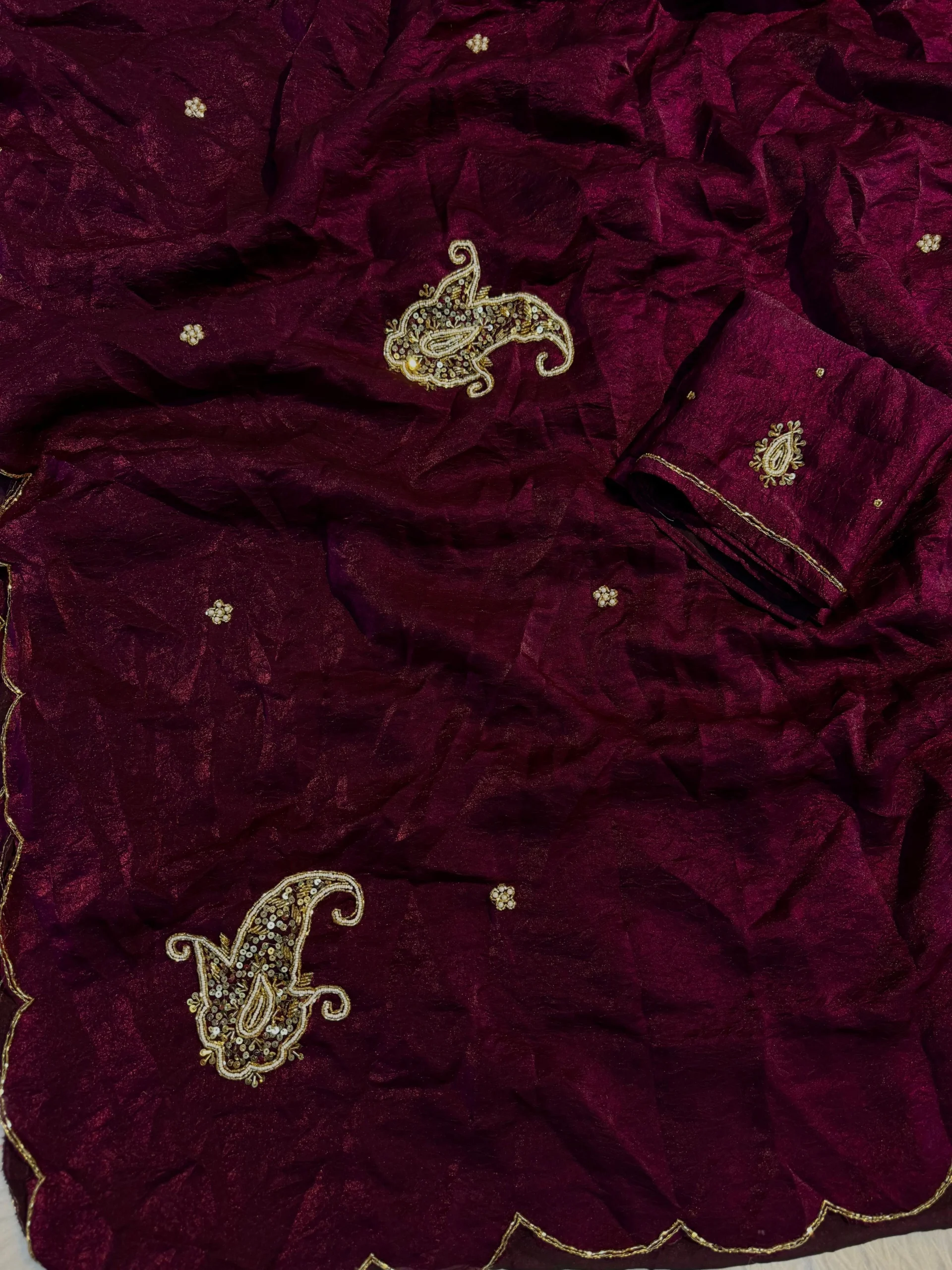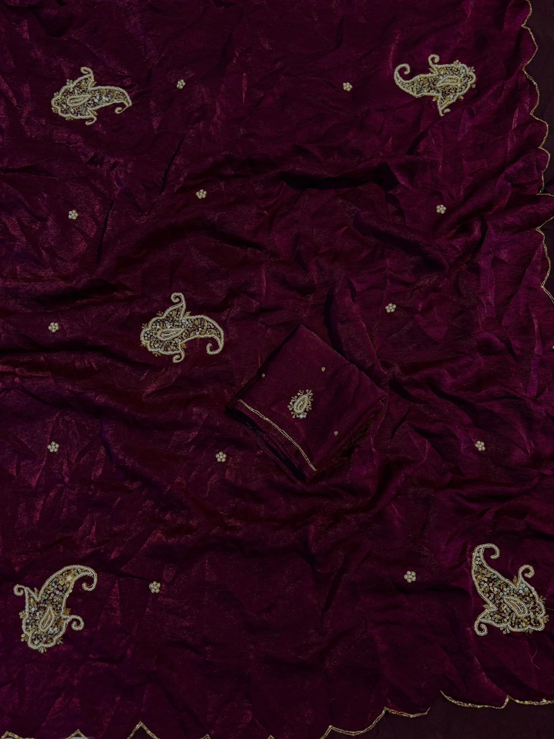 Work: Handcrafted Katdana & Moti Embellishments with Silver Zari ARCA Border